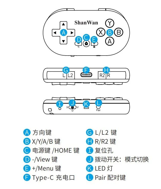 2、手柄按 Pair 配对键进行配对,LED蓝灯快闪(仅第一次使用需要进行配对 );