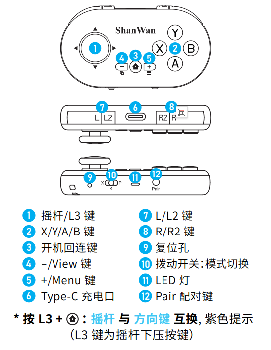 手柄切换到V档ShootingPlus模式,按手柄底部的pair键开机,指示灯绿灯快闪后,打开手机蓝牙,搜索到“ShanWan Q36 Pro”点击连接。连接成功后,绿灯常亮。